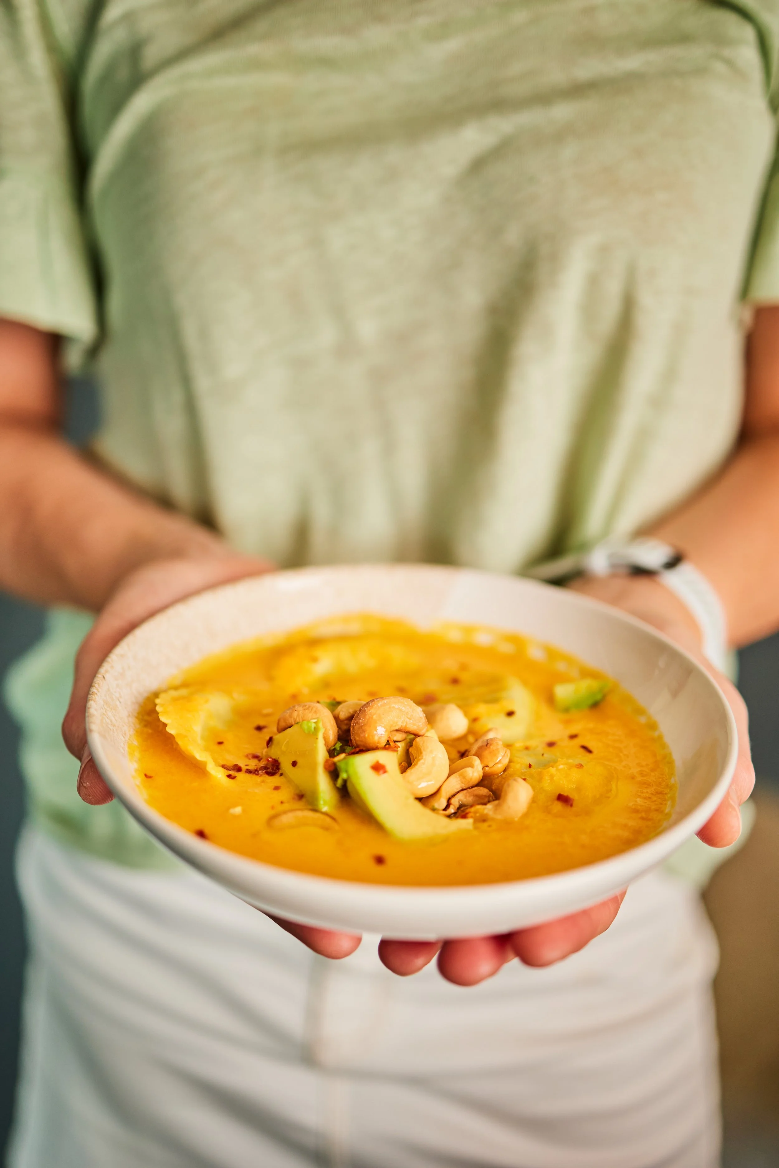 Kremet gulrot- og søtpotetsuppe: Med ravioli, avokado og cashewnøtter.