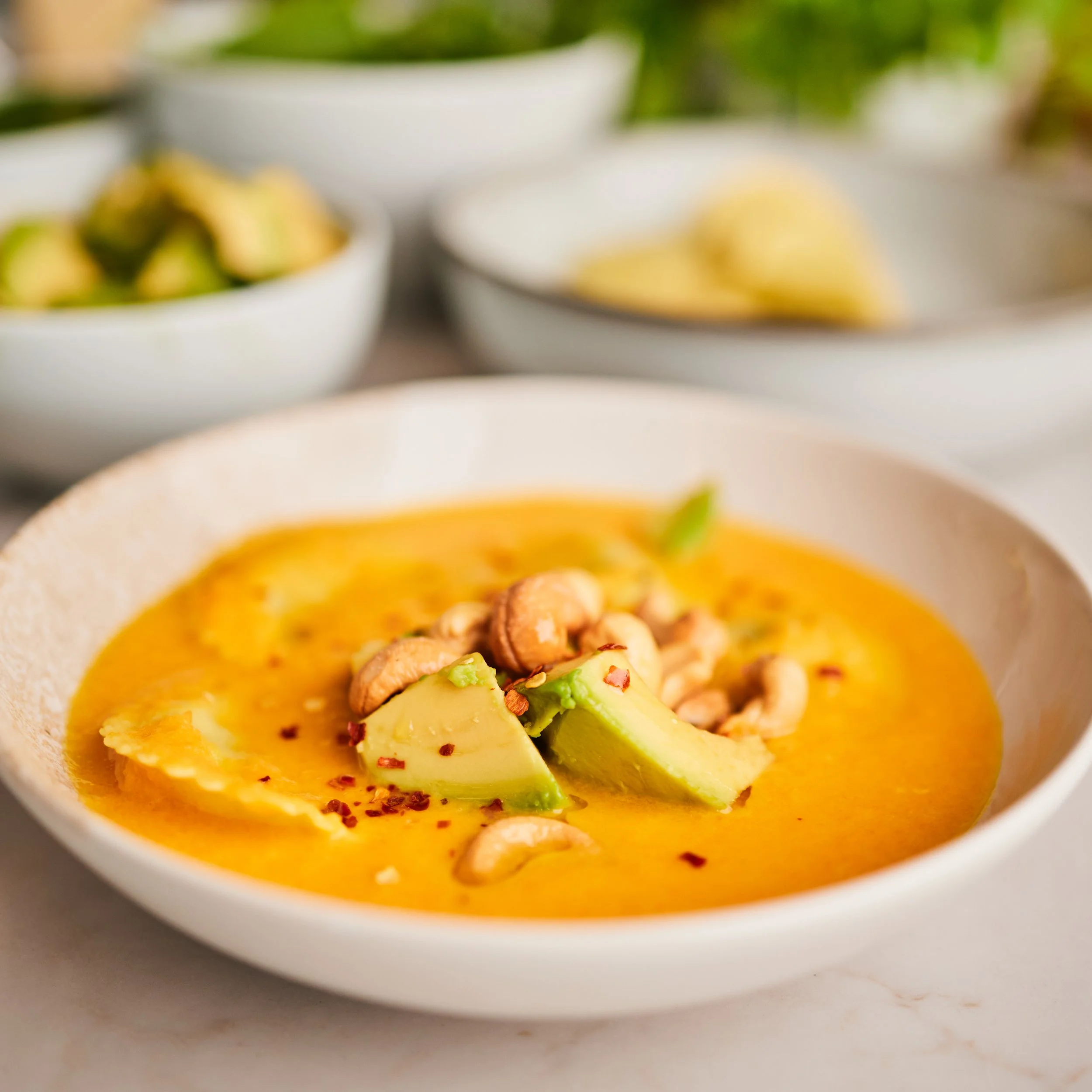 Gulrot- og søtpotetsuppe med ravioli, avokado og cashewnøtter