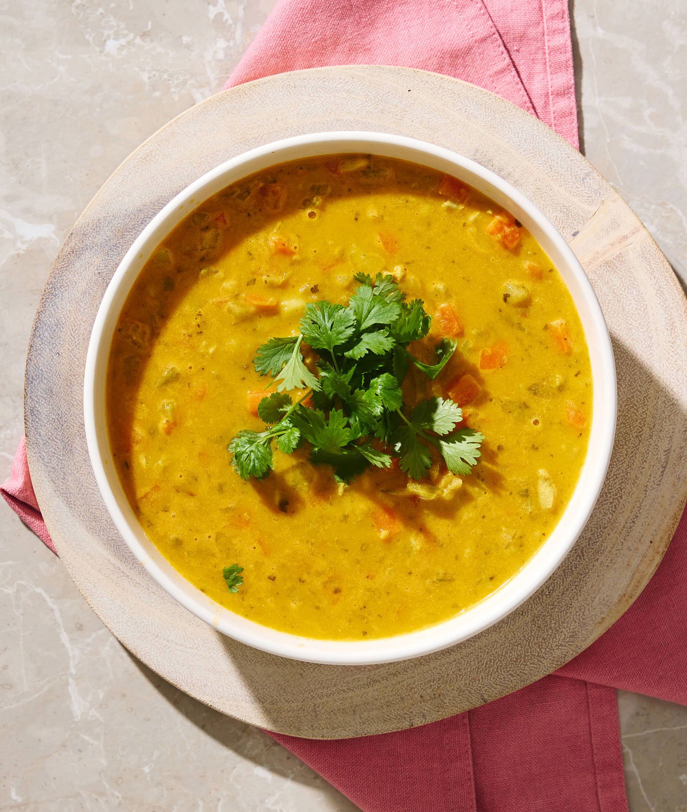 Fordel suppen i skåler, topp med frisk koriander og eventuelt en klatt yoghurt eller kokosmelk. Server med naanbrød eller ris.